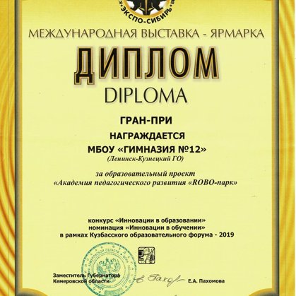 Золотая медаль областного конкурса "Инновации в образовании", Кемерово, 2018 -